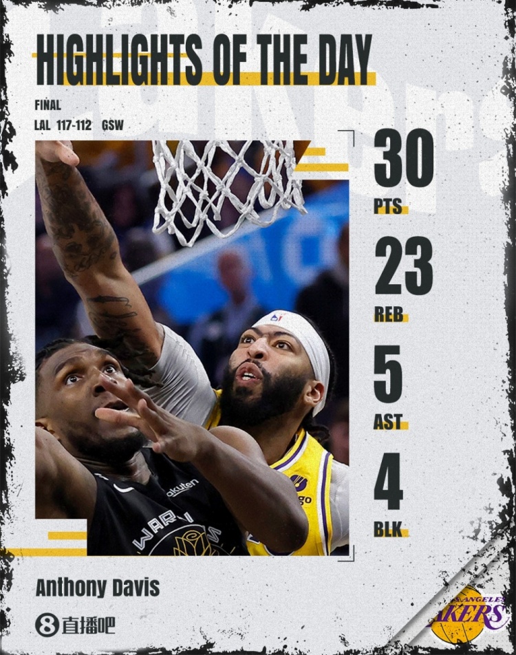 西部半决赛G1,湖人客场117-112险胜勇士拔得头筹。