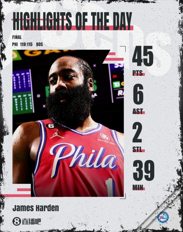本场比赛恩比德缺阵,哈登火力全开,全场比赛30投17中,三分14中7,罚球4中4砍下45分6助攻2抢断,得分追平个人季后赛最高。
