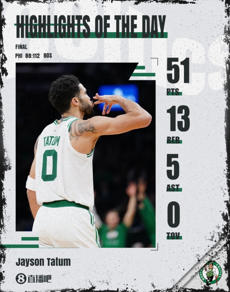 塔图姆本场比赛手感爆棚,他28投17中,三分10中6,罚球14中11,砍下51分13篮板5助攻2抢断,没有失误。